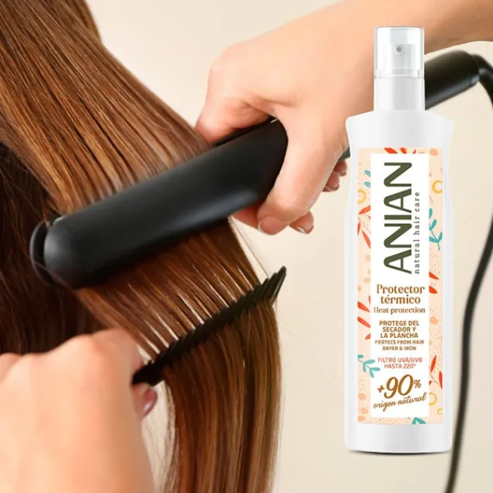 Protector Térmico de Anian es un spray que protege del secador y la plancha hasta 220ºC con filtro UVA/UVB.