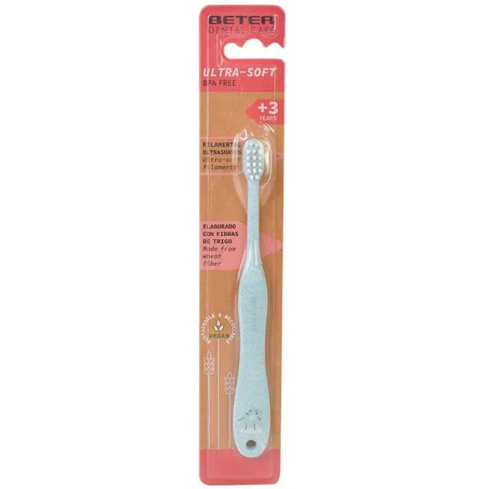 Dental Care Cepillo de Dientes Infantil + 3 Años de Beter es un cepillo dental suave para niños a partir de 3 años con mango de fibra de trigo.