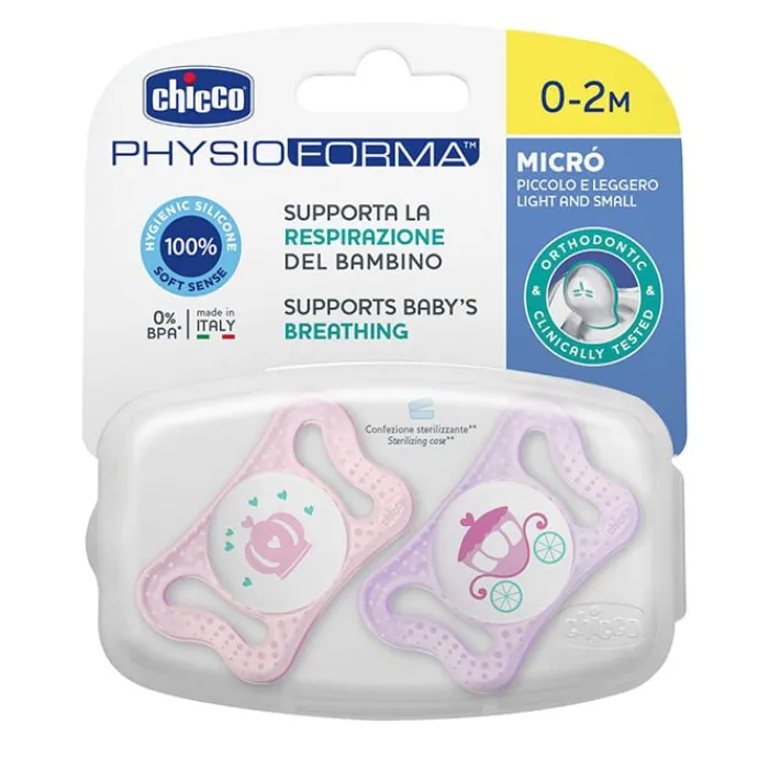 Chupete Physio Micrò Silicona Rosa 0-2 Meses de Chicco es un chupete ligero con tetina ortodóntica.