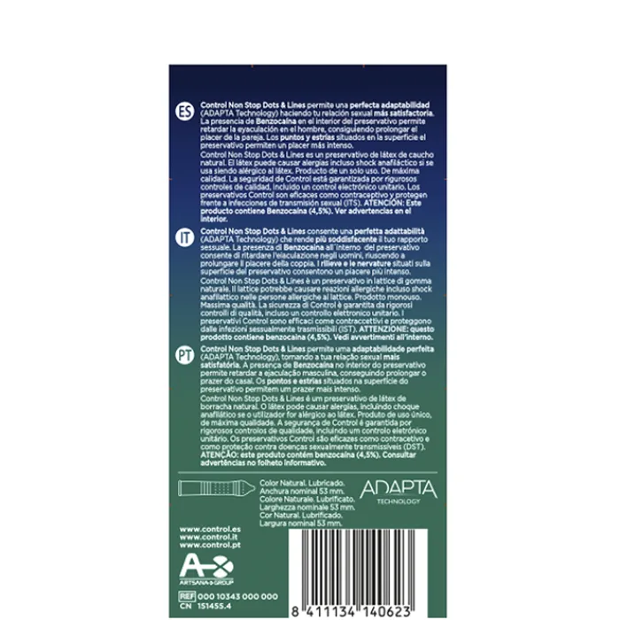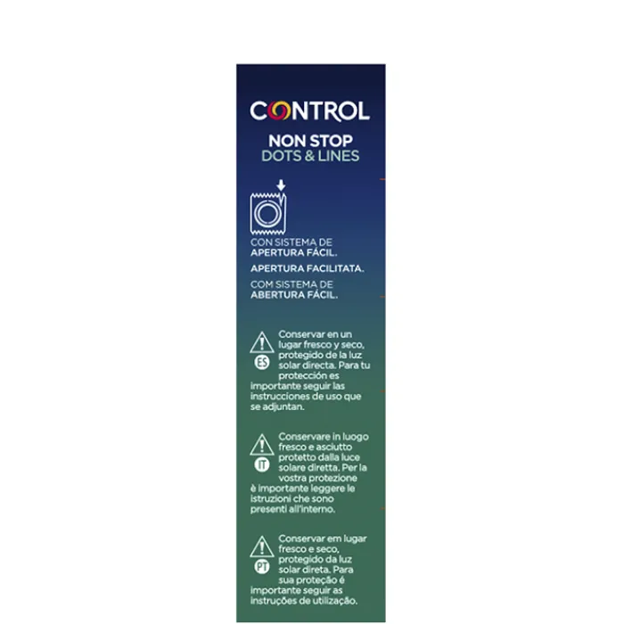 Este preservativo diseñado con puntos y líneas estratégicamente ubicados genera una intensa estimulación que prolongan la excitación permitiendo disfrutar más tiempo y con mayor satisfacción. Como resultado del uso de Control Preservativo Non Stop se favorece e intensifican las sensaciones placenteras.