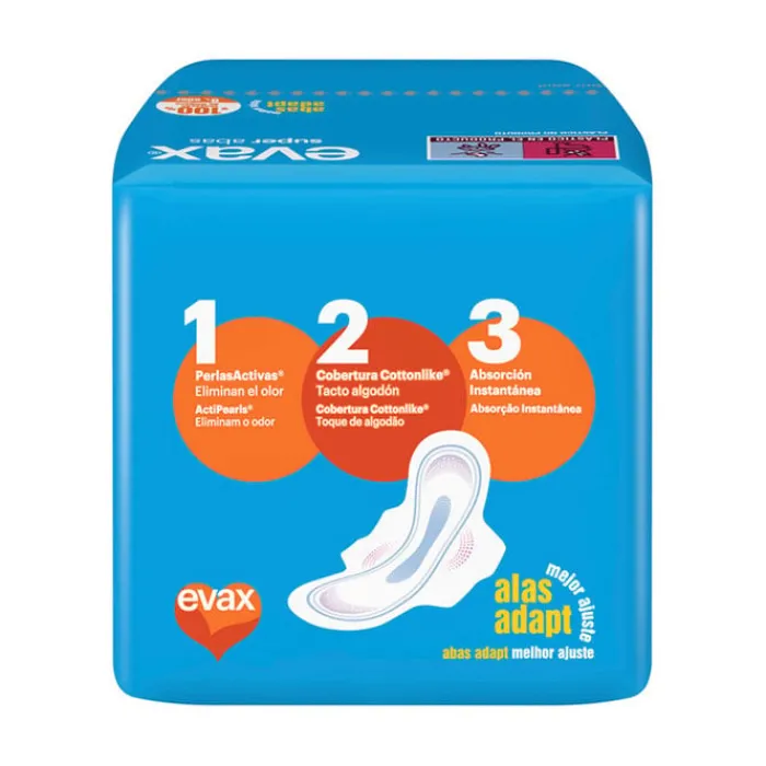 Esta compresa fabricada con tejido de cobertura de algodón con una agradable sensación de suavidad y comodidad. Garantiza la protección de larga duración. Contiene alas para evitar su desplazamiento y está indicada retener el flujo abundante. Neutralizael olor, la humedad y favorece la comodidad durante más tiempo garantizando una agradable sensación de frescor. Con Evax COTTONLIKE Super Plus Alas te sentirás más fresca, cómoda y segura durante más tiempo.