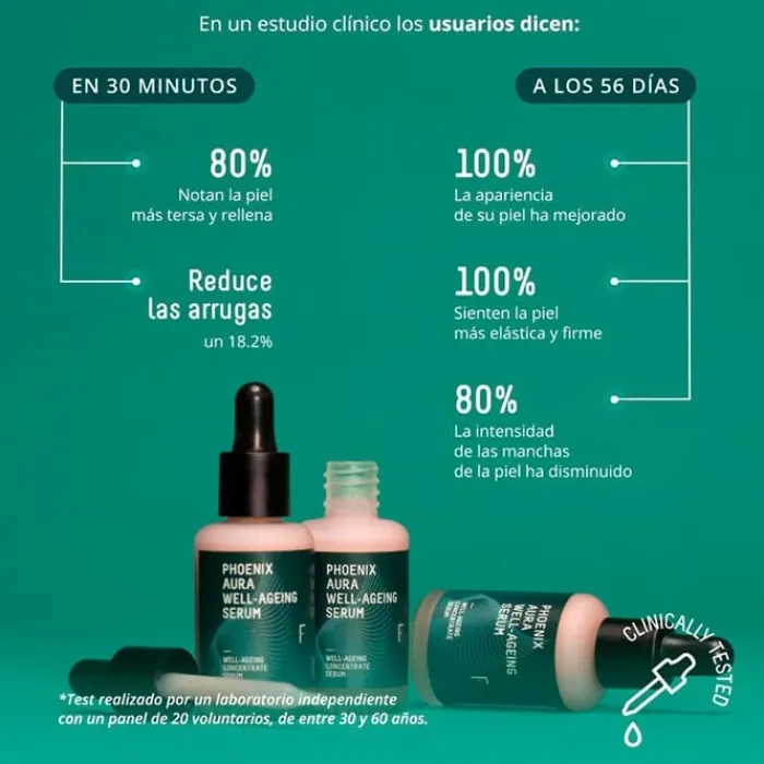 De textura fluida y fácil absorción posee un goloso aroma tropical de guayaba, papaya, violeta, rosa y granada. Freshly Phoenix Aura Well-Ageing Serum es apto para embarazadas y todo tipo de piel, incluso sensible. Está indicado para mejorar las líneas de expresión y arrugas en un 75%, así como la elasticidad y firmeza en un 100% a partir de los 30 años. Luce un rostro sedoso, radiante y rejuvenecido visiblemente.