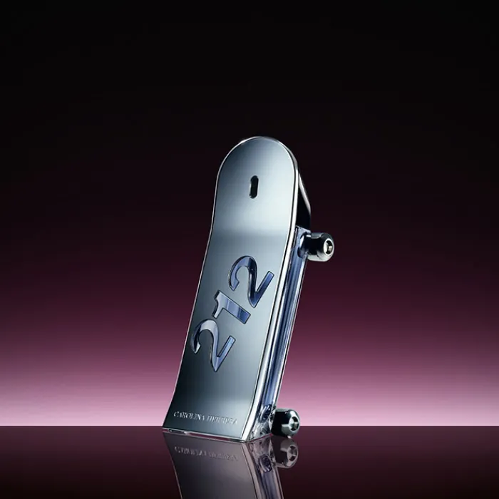 El frasco de Carolina Herrera 212 Heroes recrea un skate plateado de vidrio transparente que deja ver su jugo de vanguardia a la perfección, éste es símbolo de la juventud rebelde, para despreocupados héroes que viva la vida al máximo.