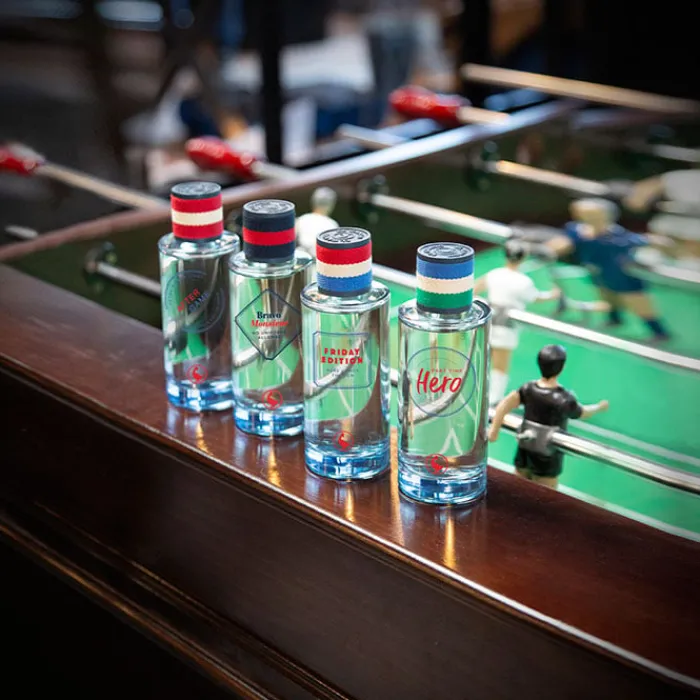 El frasco que contiene el aroma de Part Time Hero de El Ganso es de líneas curvas y sencillas. Una botella de vidrio transparente, coronado por un tapón azul marino y la jovial cinta tricolor característica de la firma. Part Time Hero, un héroe a tiempo parcial.