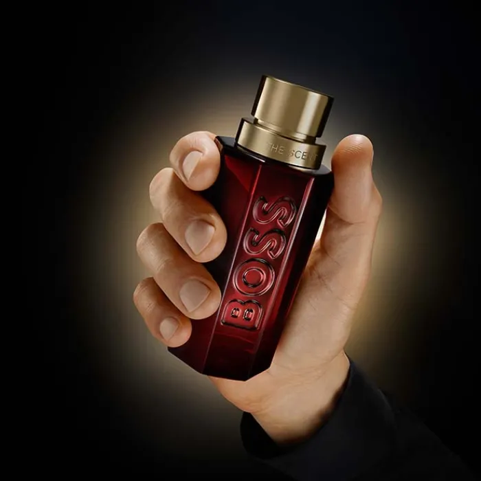 El icónico frasco de Boss The Scent Elixir Eau de Parfum Intense se presenta con el logotipo Boss sobre el vidrio lacado de color rojo intenso y el tapón dorado cálido con el monograma de la Doble B. Una forma polifacética con su rico matiz para captar la atención y reflejar el carismático y seductor aroma.