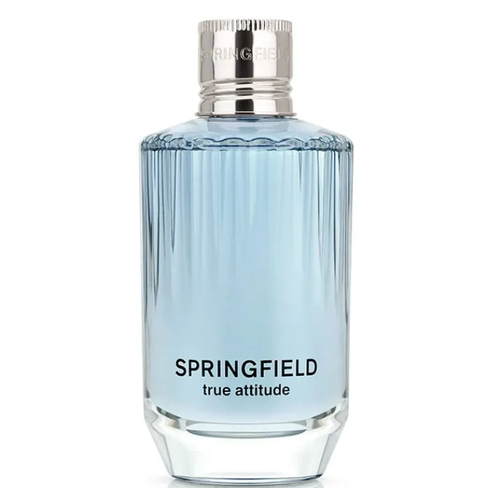 El frasco de Springfield True Attitude Eau de Toilette con líneas sencillas en las que se presenta con letras azules deja ver el jugo del perfume y está coronado por un tapón plateado brillante que le proporciona elegancia y optimismo.