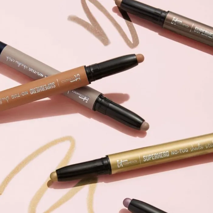 Se recomienda deslizar Superhero No-Tug Shadow Stick de IT Cosmetics sobre los párpados y difuminar la sombra con las yemas de los dedos o con una brocha de sombra de ojos de IT Cosmetics.