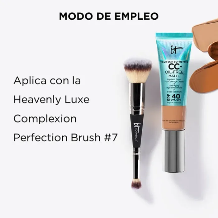 Su textura fluida mate, se extiende uniformemente facilitando la rápida absorción, minimiza las imperfecciones, rojeces, cicatrices, poros y acné realzando la belleza natural de la piel. IT Cosmetics Your Skin But Better CC+ Oil-Free Matte está indicada para mejorar la textura y aspecto de todo tipo de piel mixta o grasa con acné con poros dilatados, acné. La piel luce perfeccionada, sin brillos, homogénea y radiante.