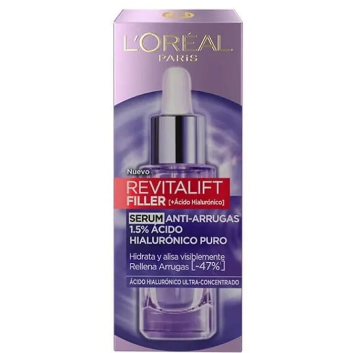 Contiene una pipeta que facilita la dosificación del producto y recoge la cantidad necesaria en cada aplicación. De textura ultraligera, no grasa se distribuye uniformemente por el rostro y es de rápida absorción. Recomendado para todo tipo de piel L’Oréal Revitalift Filler Sérum Anti-Arrugas rejuvenece la piel progresivamente, luce más flexible, tersa y jugosa.