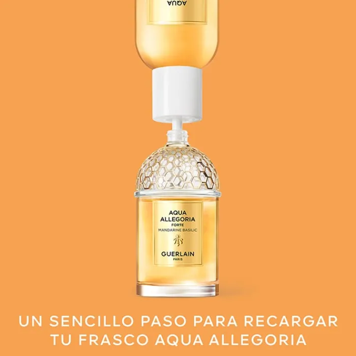 El frasco de Aqua Allegoria Mandarine Basilic Forte está diseñado para durar, es desenroscable, rellenable y reciclable. Su formato recarga permite rellenar los frascos de 125 ml y 75 ml.