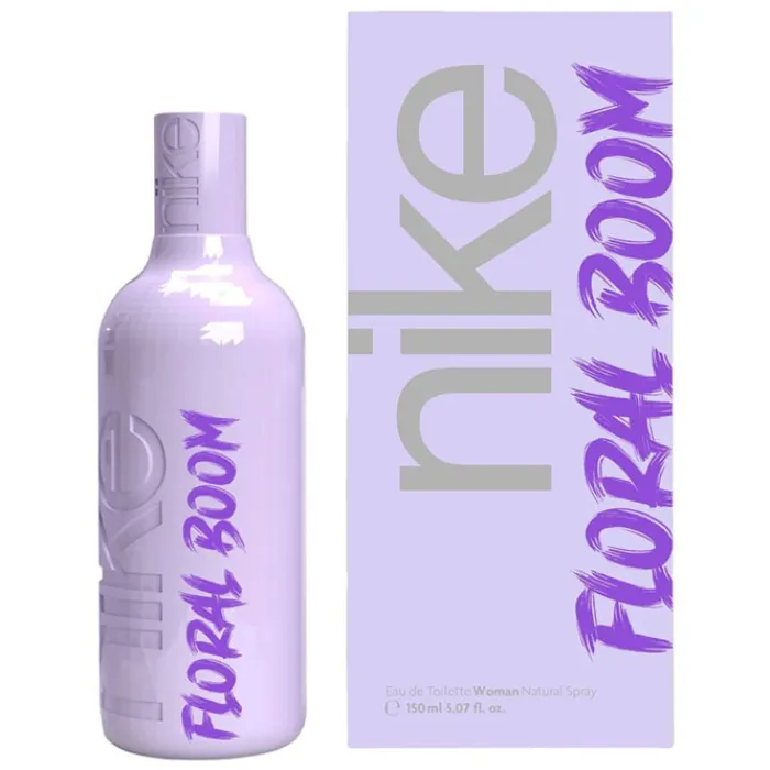 El frasco icónico de Nike Floral Boom Eau de Toilette se viste de gala para descubrirnos un diseño esférico y envolvente de líneas curvas que se tiñe de un color lila pálido que armoniza con el tapón que lo corona y contrasta con las letras de su nombre en un morado luminoso el a lo largo de él.