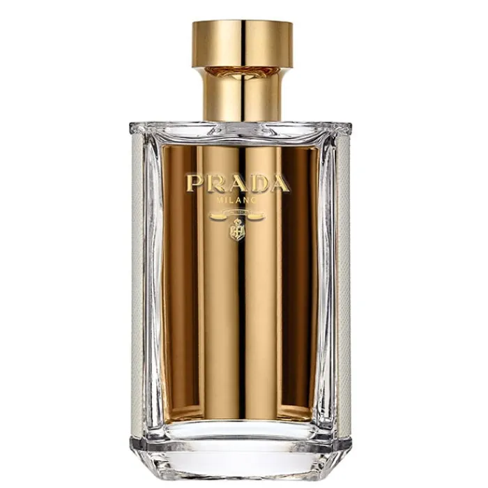 El frasco de La Femme Prada retoma el lenguaje clásico y distintivo de la firma. El blanco y dorado, se aplican a la fragancia femenina como un reflejo de su esencia sensual, mientras que el cristal ambarino subraya el exotismo del perfume. Además el diseño casi arquitectónico del frasco homenajea los interiores de Prada, que recuerdan al estilo de un joyero, el juego de espejos en su interior refleja la luz y multiplica las imágenes. La Femme Prada una evasión sensorial hacia la calidez del sol.