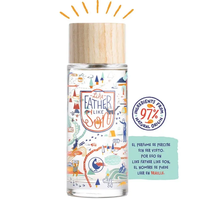 ¡De tal palo tal astilla! Esta fragancia para compartir, creada en 2023, viene con instrucciones de uso: mantener cerca del alcance de los niños ¡y de los padres! Like Father Like Son Eau de Toilette contiene ingredientes 97% de origen natural, biodegradables y es vegano.