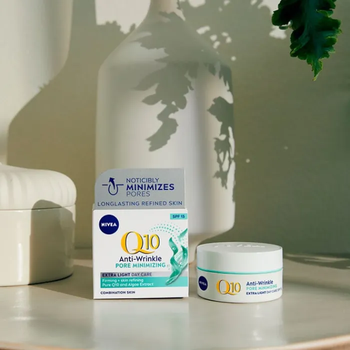 De textura gel crema ultraligera se distribuye uniformemente y es de rápida absorción. Recomendada para el atenuar los poros, rejuvenecer y retrasar la aparición de arrugas Nivea Q10PLUS Anti-arrugas Cuidado de Día SPF15 Piel Mixta luce purificada, firme y radiante.