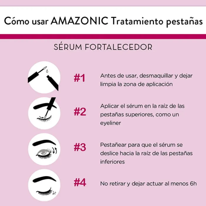 Para comenzar a utilizar Amazonic Pestañas Sérum Fortalecedor + Voluminizador de Nuggela & Sulé, desmaquilla y limpia la zona y aplica el sérum en la raís de las pestañas superiores. Pestañea para que llegue hasta las pestañas inferiores. Dejar actuar hasta 6 horas.