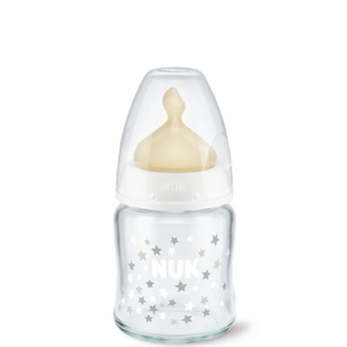 Biberón FC+Cristal 0-6 meses M Látex de Nuk es un biberón de vidrio con tetina anatómica de látex.