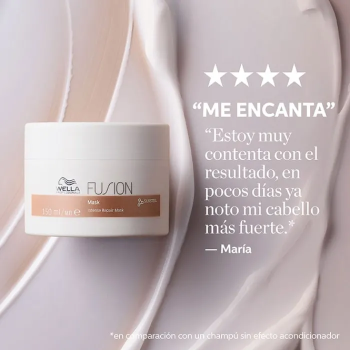 Su formulación con tecnología de fusión silksteel, contiene aminoácidos de seda y lípidos micronizados que aumentan la resistencia del cabello frente a la rotura originada como consecuencia del peinado y daño mecánico diario. Incluye metal purifier que protege el cabello contra los metales perjudiciales presentes en el agua. Wella Professionals Fusion Mask está indicada para desenredar, suavizar y fortalecer el cabello seco y dañado, luce más manejable, fuerte, sedoso y brillante.