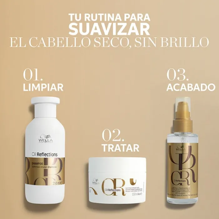 Se recomienda aplicar Oil Reflections Mask de Wella Professionals en la palma de la mano, repartir de medios a puntas, dejar actuar entre 2 y 5 minutos y posteriormente, aclarar con agua. Para completar el cuidado del cabello, es conveniente utilizar el champú, acondicionador y el aceite capilar Reflections de Wella Professionals.