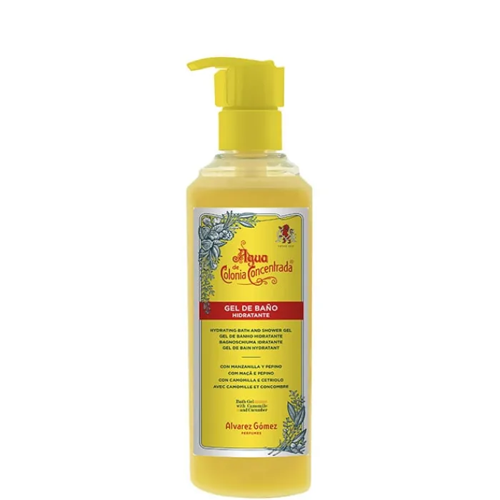 Álvarez Gómez Gel de Baño Hidratante contiene una formulación emoliente a la vez de tonificante a base de ingredientes naturales como son los extractos de Manzanilla, Pepino y Coco que cuidan y limpian con suavidad el cabello y la piel dejando una fresca sensación de limpieza así como un suave perfume.