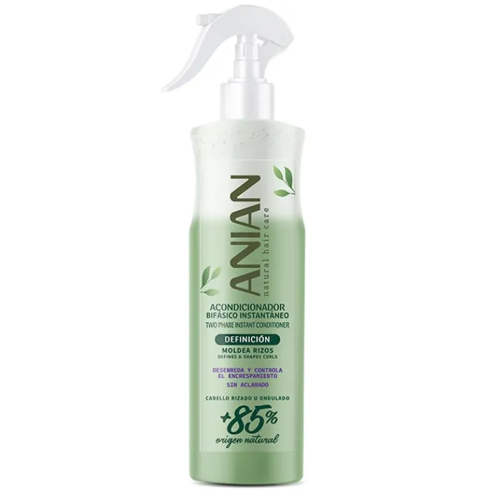 Acondicionador Bifásico Definición de Anian es un suavizante de dos fases que define los rizos, elimina el encrespamiento, nutre e hidrata el cabello.