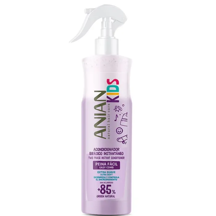 Acondicionador Bifásico Kids de Anian es un acondicionador sin aclarado que hidrata, desenreda y controla el encrespamiento del cabello de los niños.