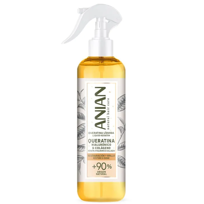 Queratina Líquida, Hialurónico & Colágeno de Anian es una sérum restaurador con queratina, aceite de jojoba y karité para cabello dañado y encrespado.