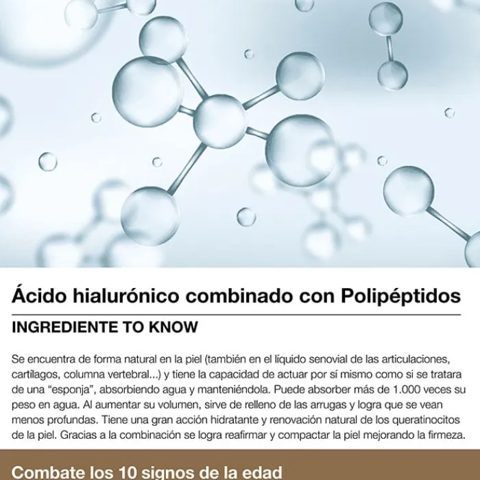 Este contorno de ojos nutre, hidrata y regenera en profundidad la piel, restaurando su elasticidad y confort. Gracias a los activos que contiene su formulación enriquecida y concentrada con péptidos y de ácido hialurónico, la piel se redensifica, se reduce la apariencia de las líneas de expresión, arrugas de comisura de labios y contorno de ojos. Incluye SPF15 que actúa contra los factores externos que provocan el envejecimiento prematuro.