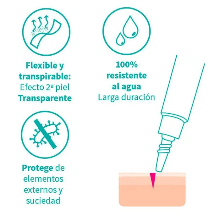 Este adhesivo tisular de uso tópico protege la piel de pequeñas lesiones cutáneas como rozadoras, cortes superficiales, grietas, rasguños, padrastros, erosiones… en una sola aplicación. Su formulación contiene activos que sellan la superficie impidiendo que la contaminación acceda a la zona afectada.
