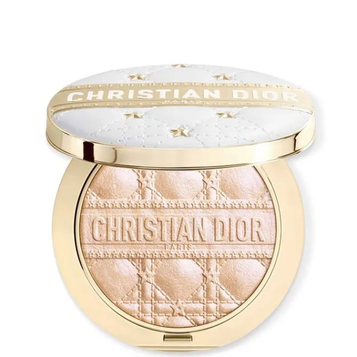 El estuche Dior Forever Glow Luminizer – Edición Limitada, con motivo de las fiestas de fin de año, se presenta adornado con la banda Christian Dior y un motivo Cannage salpicado de estrellas.