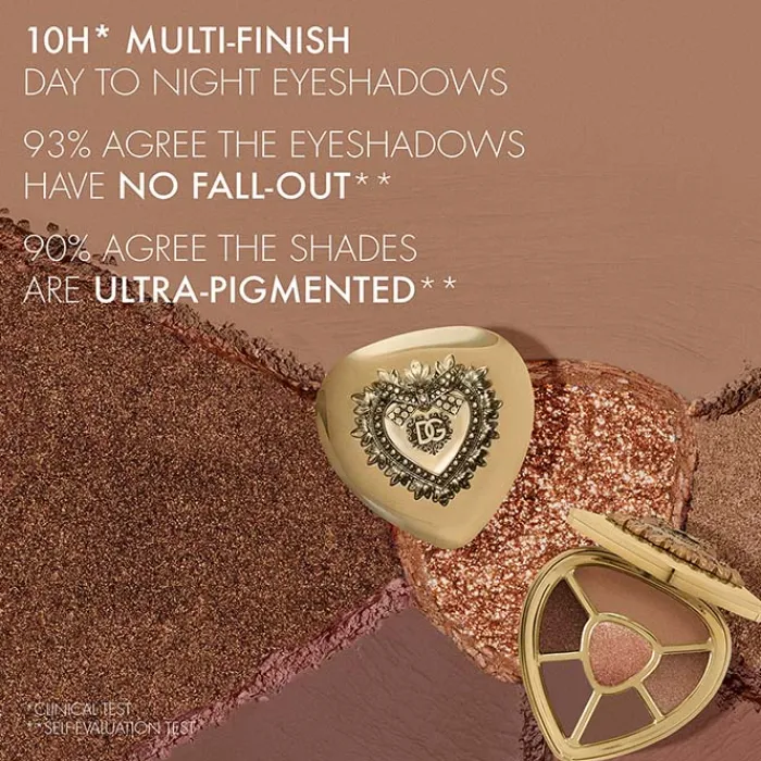 La textura Dolce & Gabbana Evericon Eye Palette en polvo ultra pigmentada ofrece combinaciones infinitas y acabados deslumbrantes en mate, satinado, metálico suave y brillo.