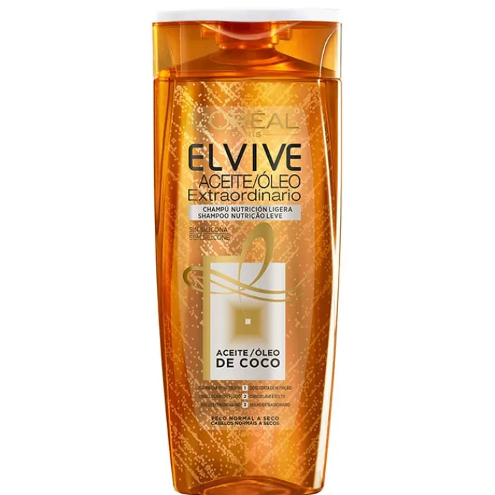 Este champú restaura el cabello, le proporciona vitalidad, nutrición leve, brillo y belleza sublime. Gracias a su formulación enriquecida con aceite de coco de textura ultraligera, nutre la fibra capilar sin apelmazar y proporciona suavidad que protege intensamente el cabello. Recomendado para cabello normal a seco ELVIVE ACEITE EXTRAORDINARIO Aceite de Coco Champú el cabello luce radiante y sedoso, flexible.