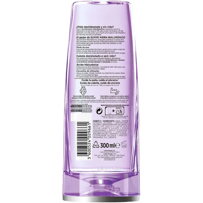 Recomendado para . Formulado con plástico 100% reciclable que contribuye a la protección del medio ambiente. Como resultado de aplicar Elvive HIDRA HIALURÓNICO Champú la hidratación del cabello se multiplica, luce más denso y revitalizado.