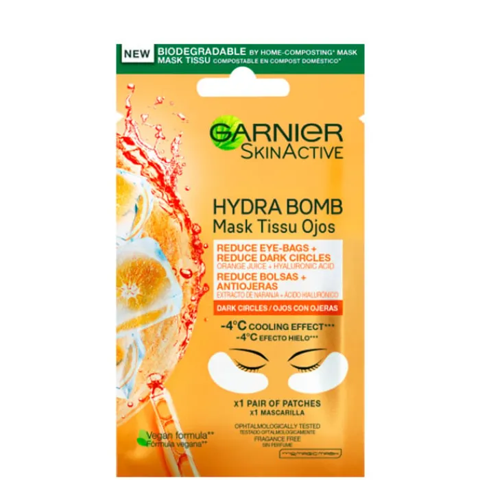 Estos parches para el contorno de ojos poseen una fórmula muy fresca enriquecida con jugo de naranja y ácido hialurónico. En tan sólo 15 minutos el contorno se siente más hidratado, desfatigado, luminoso, fresco, bolsas y ojeras menos visibles. Indicado para todo tipo de piel.