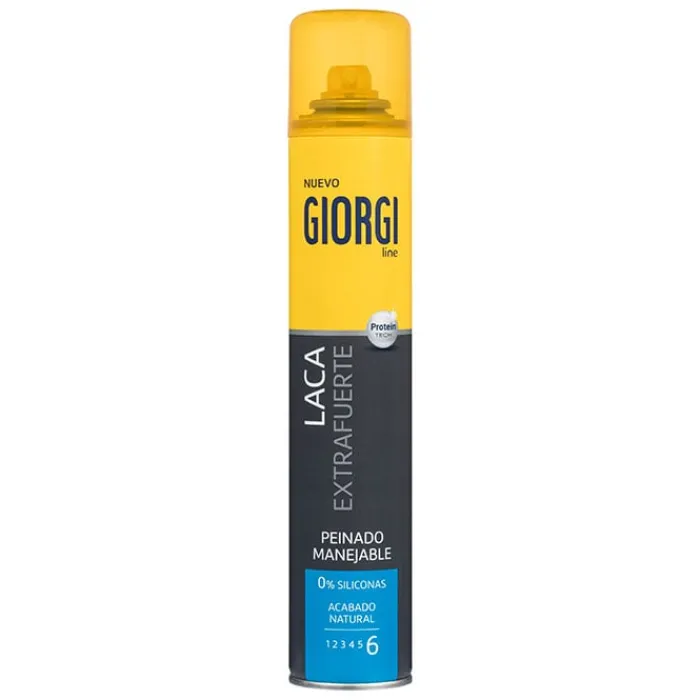 Laca Extrafuerte de Giorgi es una laca protectora de humedad sin residuos que fija el cabello.