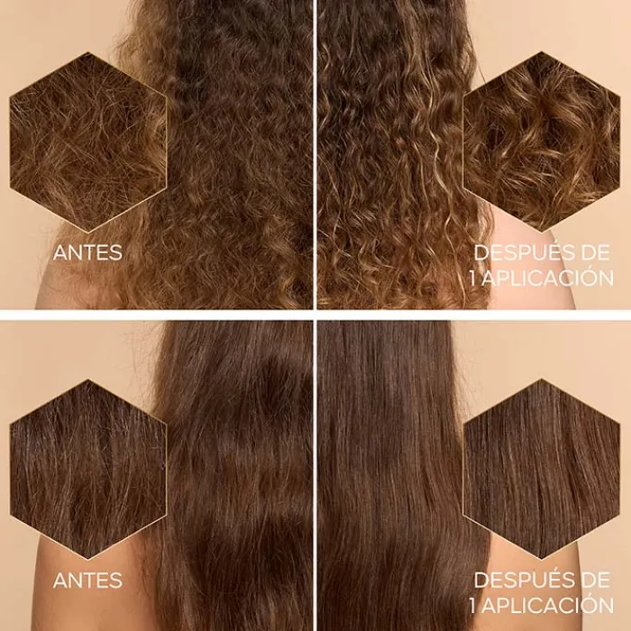 Este tratamiento para el cabello combina propiedades regeneradoras para redensificar, reparar la fibra capilar en profundidad y protegerla de la humedad, la contaminación y los aparatos de calor de hasta 230ºC.