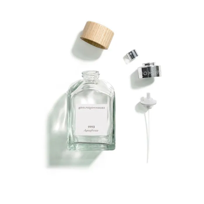 El frasco tiene una forma pura, elegante, de líneas rectas y depuradas, siguiendo la línea de las Aguas frescas de Adolfo Domínguez. Una botella única, original y algo tosca, de vidrio transparente representando frescura a la par que intensidad. La botella simula los recipientes transparentes para servir whisky. En su parte superior el tapón es 100% de madera FSC y 0% plástico para añadir elegancia, masculinidad y distinción al conjunto.