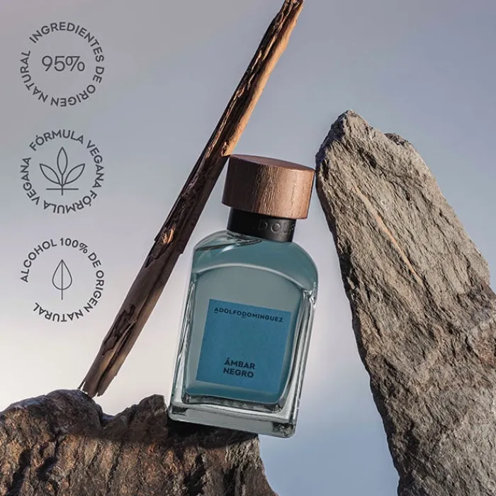 Adolfo Dominguez presenta Ámbar Negro EDP con una formulación vegana, que contiene un 95% ingredientes de origen natural. Su envase de recarga ecológica con un sistema de cierre automático de rosca, fabricado con vidrío reciclado, reciclable y reutilizable de por vida para fomentar un abastecimiento responsable y sostenible permitiendo usar menos material de embalaje. Su tapón es 100% de madera procedente de bosques bien gestionados que aseguran la reciclabilidad y reducción de la huella humana en el medio ambiente.