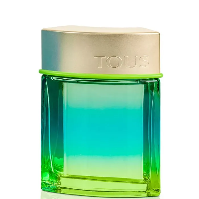 El frasco de Tous Man Chill Eau de Toilette es líneas rectas como el resto de las fragancias de la colección Tous Man. Esta vez teñido en un degrado verde, azul y turquesa, coronado por un tapón dorado.