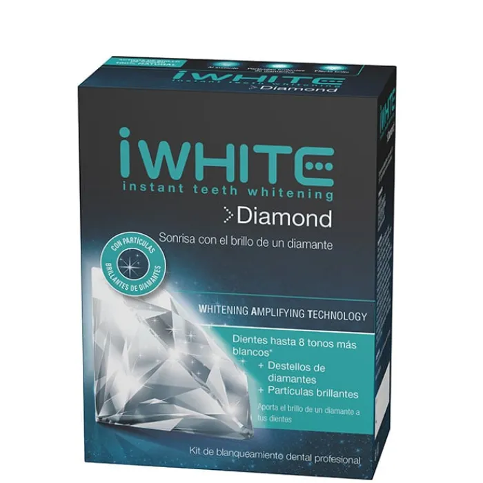 Este tratamiento de blanqueamiento dental en casa, contiene cristales bioactivos de calcio que se fijan a la superficie del diente y produce un efecto de blanqueamiento óptico de hasta 8 tonos con destellos de cristales azules y partículas brillantes. El blanqueamiento dental con Iwhite Diamond Kit es 100% seguro no ocasiona ningún efecto secundario al ser libre de peróxido de hidrógeno.