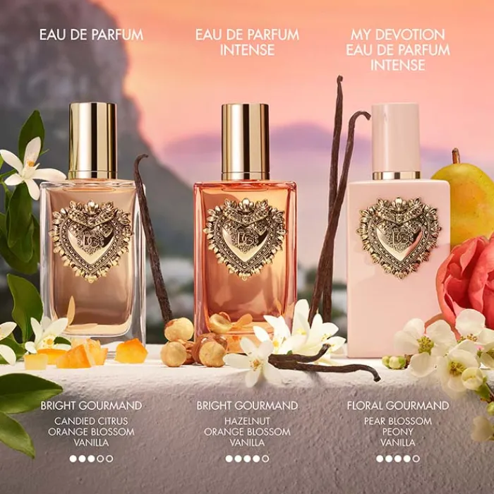 Creada en 2025 por el maestro perfumista Olivier Cresp, Dolce & Gabbana My Devotion Eau de Parfum Intense pertenece a la familia olfativa gourmand floral. La suave y elegante flor de pera abre la fragancia entrelazándose con la nota afrutada y vibrante de la grosella negra. En el corazón florece un radiante ramo de peonías, que da paso a un fondo de facetas cálidas y sensuales con la vainilla de Madagascar.