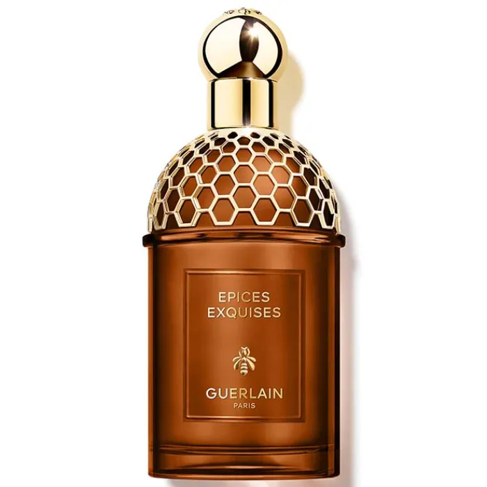 El frasco de Guerlain Absolus Allegoria Épices Exquises Eau de Parfum adopta el frasco emblemático de la colección Absolus Allegoria, teñido en vidrio de color marrón ámbar rinde homenaje al mítico frasco de panal de abejas, líneas rectas, curvas y cilíndricas, coronado por su preciosa joya dorada. Ha sido elaborado en Francia y realizado a partir de un 15 % de vidrio reciclado. Su vaporizador desenroscable y su lacado transparente facilitan su reciclaje.