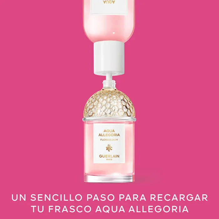 El frasco Guerlain Aqua Allegoria Florabloom Eau de Toilette rinde homenaje al mítico frasco de panal de abejas, líneas rectas, curvas y cilíndricas, coronado por su preciosa joya dorada. Es reciclable, rellenable y fabricado en Francia a partir de un 15% de vidrio reciclado.