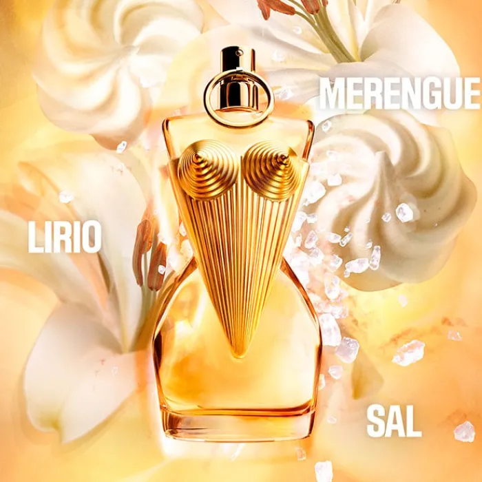 Creada en 2023 de la mano del maestro perfumista Quentin Bisch, Gaultier Divine Eau de Parfum pertenece a la familia olfativa Floral Salada Gourmand. Su esencia sorprendente de brisa floral marina se inicia con sal fusionada en un corazón de lirio que irradia majestuosidad. Culmina con un irresistible merengue que despierta los sentidos y seduce intensamente.