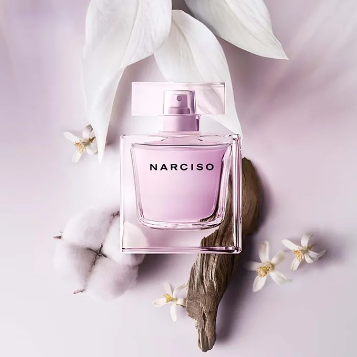 El frasco de Narciso Radiante Eau de Parfum se presenta con un cristal transparente que se llena de luz, infundido con un color púrpura pastel. Tiene certificación vegana y está elaborado con un 86% de ingredientes de origen natural.