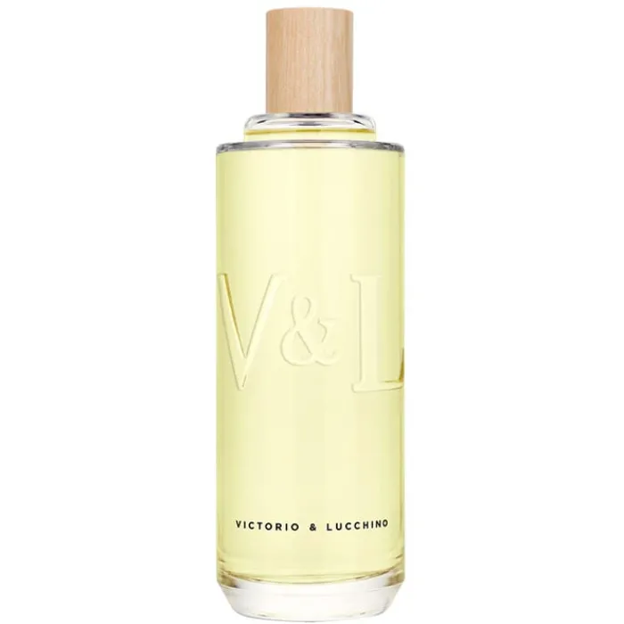 El frasco de Aguas Esenciales Pura Vida EDC de Victorio & Lucchino es robusto, de líneas sencillas y puras incluye en relieve las letras de la firma. De jugo amarillo refrescante se corona con un tapón de madera que denota su naturalidad y compromiso con el medio ambiente.