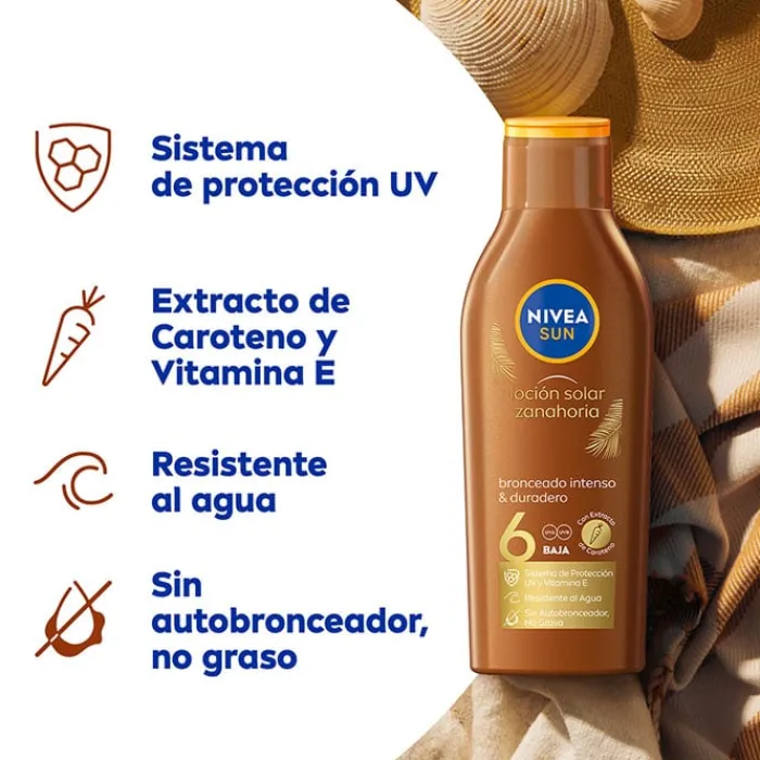 Loción Solar Zanahoria SPF6 de Nivea Sun es una loción solar de baja protección con extracto de zanahoria.