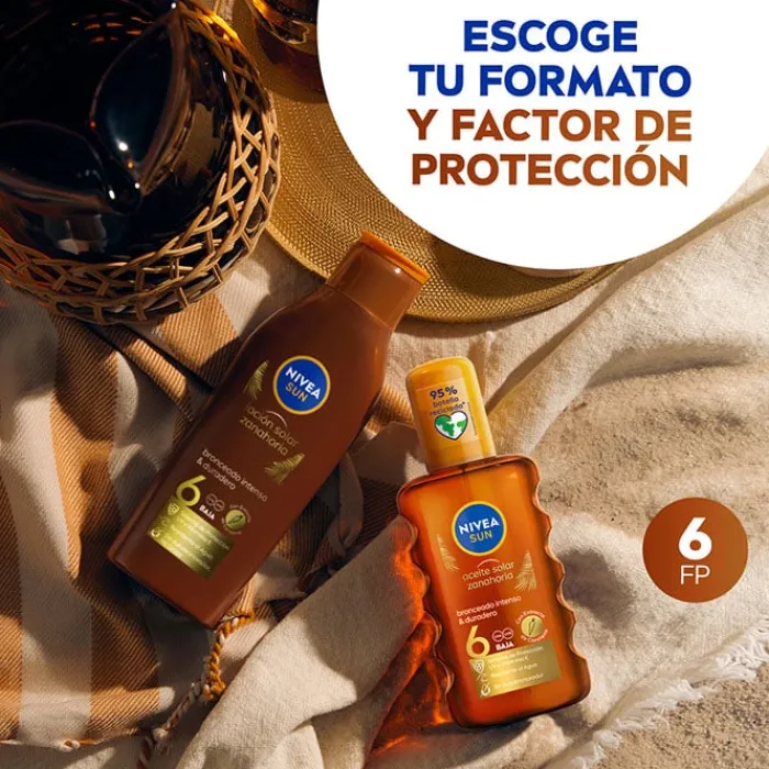 Su formulación no posee octinoxato ni oxibenzona, siendo respetuosa con el medio marino. Es resistente al agua, su textura fundente nutre la piel y proporciona elasticidad. Como resultado de aplicar Nivea Loción Solar Zanahoria SPF6 la piel luce un bronceado dorado e intenso.