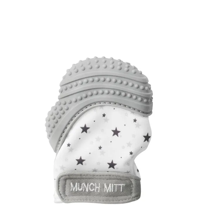 Manopla de Dentición Bebé Gris de Saro Baby es una manopla de tela con mordedor de silicona para calmar las molestias de la dentición.