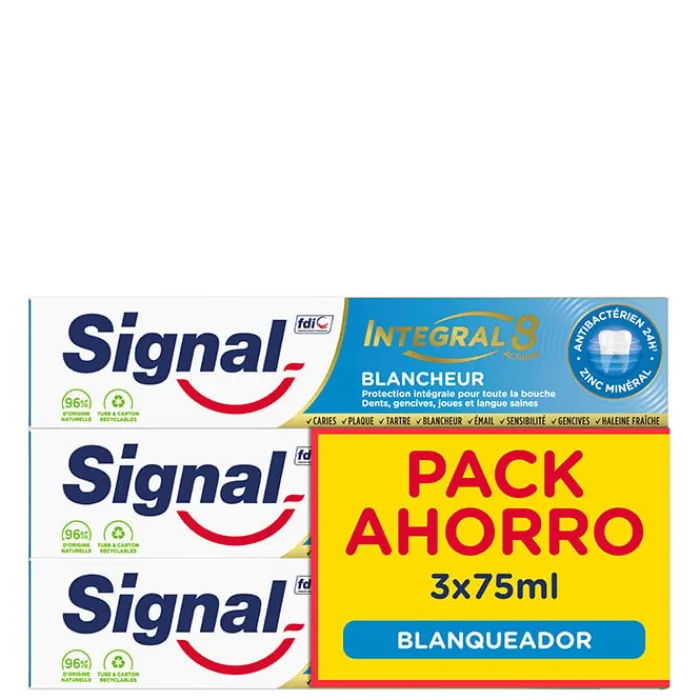 El cartón que contiene su envase de la pasta de dientes Signal es reciclable para contribuir a la sostenibilidad del medio ambiente. Signal Dentífrico Integral 8 Blanqueador es perfecto para garantizar la higiene bucodental diaria las encías se mantienen saludables y los dientes más blancos, brillantes y frescos.