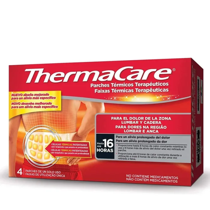 Los dolores de cadera y zona lumbar se atenúan a lo largo de 16 horas desde su aplicación. Los parches están formados células térmicas patentadas. Como resultado de aplicar ThermaCare Parche Lumbar y Cadera se reduce el dolor y se produce una agradable sensación de bienestar.